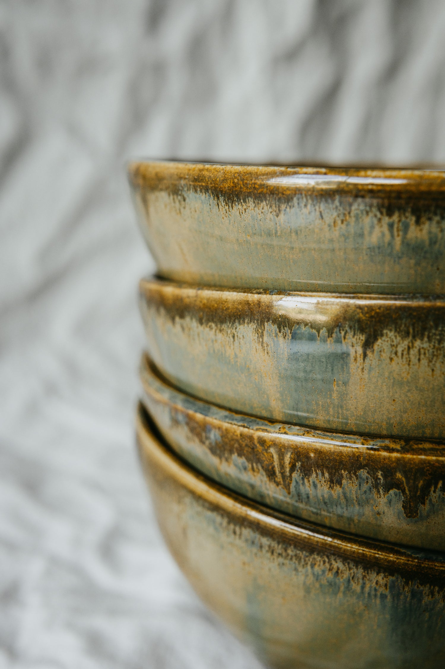 Nadat de potten zijn afgekoeld van de biscuitbak op 950°C, zijn ze dorstig naar glazuur. Door de hoge temperatuur van de eerste bak zijn de potten niet meer zo breekbaar, maar ze zijn nog niet helemaal waterdicht. Daarvoor moet je de potten glazuren en nog warmer bakken. Door de hitte van de tweede bak wordt het glazuur een soort glaslaag. Ik probeer mijn glazuren zo veel mogelijk zelf te maken, maar ik ben ook nog aan het leren.